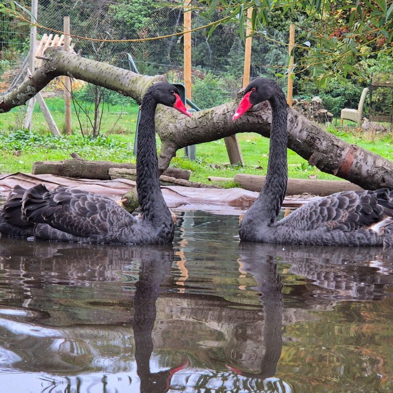Black swans are elegant, hardy waterfowl that adapt well to managed ponds and lakes. Native to Australia, they thrive in temperate climates and make striking additions to wildfowl collections. A secure water source with surrounding grazing areas is essential. In captivity, their diet should consist mainly of short grasses and quality waterfowl pellets to maintain good condition. Black swans often breed readily, forming strong pairs and nesting on mounds near water. Breeding typically occurs in spring and autumn, with clutches of 4–7 eggs and both parents sharing incubation duties. With proper care and space, they can thrive and reproduce successfully.